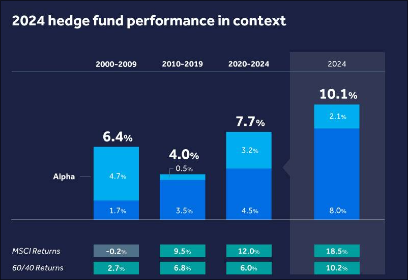 In 2024, hedge funds delivered average net returns of 10.1% and generated 2.1% alpha, representing their strongest annual performance since before the Global Financial Crisis. For context, between 2010 and 2019, when interest rates were low and equity markets were less volatile, hedge funds produced only 4.0% net returns and less than 1% alpha, while over the more recent 2020–2024 period they averaged 7.7% net returns with 3.2% alpha. For context, the 2024 hedge fund return of 10.1% was broadly in line with the 10.2% return of a traditional 60/40 public equity and fixed income portfolio. This returns comparison suggests that going forward, hedge funds could provide higher returns with lower risk, as many hedge fund strategies such as equity long/short are designed to offer market upside participation while incorporating embedded downside protection.