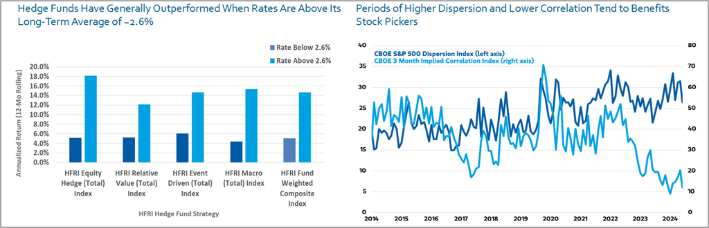 Hedge fund strategies in general tend to perform well in a higher interest rate environment, as shown in the chart to the left below. Higher interest rates tend to coincide with higher market volatility, leading to higher stock dispersion and greater return potential. As noted in the chart below, equity hedge (i.e., long/short) strategies tend to outperform other hedge fund strategies due to their ability to generate alpha through their long/short approach, capturing relative market movements across single stocks, sectors, and asset classes. Furthermore, equity hedge strategies typically exhibit low correlation with broader markets, which offers diversification benefits across investors’ portfolios.
