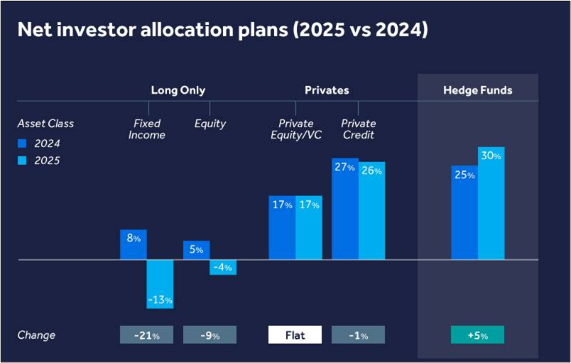 According to the 2025 Barclays Strategic Consulting Investor Survey (representing $8.6T of AUM across 325 institutional investors), hedge funds are set to receive the largest net allocation increase among major asset classes. As shown in the chart below, 30% of institutional investors expect to increase hedge fund allocations in 2025, up from 25% in 2024, representing a net gain of +5%. This stands in contrast to long-only public equity and fixed income strategies that are projected to see net outflows (–9% and –21%, respectively), while allocations to private equity and private credit are expected to remain stable. Taken altogether, the survey results point to a rotation of capital away from traditional long-only exposures and into hedge fund strategies.