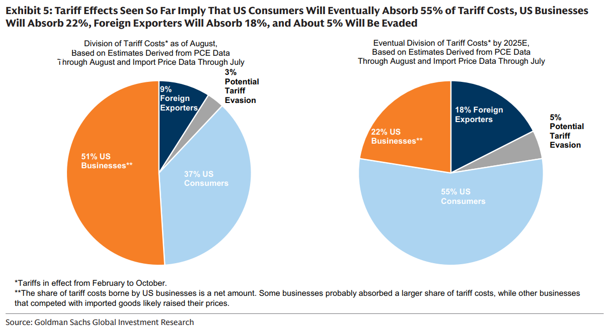 US import tariffs remain a key concern for investors given their potential impact on inflation, interest rates, and consumer demand, and the resulting effect on both S&P 500 valuation multiples and corporate earnings. Goldman Sachs estimates that, as of June 2025, US businesses were absorbing 64% of tariff costs while consumers bore only 22% of the cost. However, this burden is expected to flip by October 2025, with consumers projected to absorb 67% of tariff costs and businesses only 8%, as companies move to offset margin pressure by passing higher costs through to end users. As a result, Goldman forecasts that Personal Consumption Expenditures (PCE inflation will rise to 3.2% year-over-year by December 2025, up from 2.6% at the start of 2025, and still above the Fed’s 2% target.)