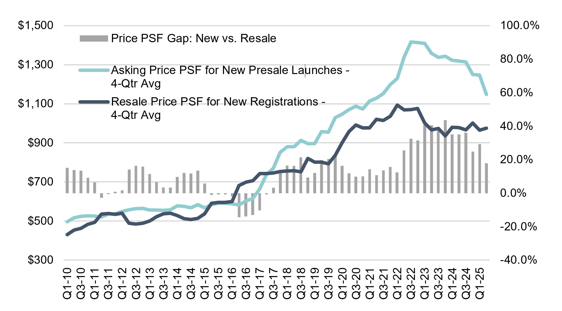 According to Urbanation, presale condo prices are expected to keep declining in 2025, falling a total of 15% to 20% from the 2023 peak of about $1,400 psf to roughly $1,150 psf this year. The price premium of presale over recently built resale units has narrowed from a 40% peak to 18% as of Q2 2025, essentially back to pre-pandemic norms seen in 2018–2019. That said, according to Urbanation, in order to pull the ‘typical mom-and-pop’ buyers off the sidelines, the premium likely needs to compress to below 10%. At the same time, during the first half of 2025, resale condo transactions in the GTA for units under $500K increased 47% from the same period last year to reach a four-year high. There are numerous private equity groups actively raising funds and acquiring blocks of unsold units.