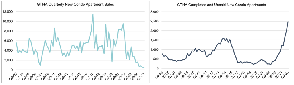 According to Urbanation, the GTA’s new condominium apartment market recorded only 502 sales in Q2 2025, 91% below the 10-year average and at 30-year lows. Sales declined 10% from Q1 2025 and were down 69% year-over-year. Historically, the second quarter has been the strongest period of the year for new condo sales. Inventory of newly completed but unsold condominium apartments reached a record 2,478 units in Q2 2025, more than double the level in 2024 and over five times higher than in 2023. Developers sold just 131 units from completed projects during the quarter, leaving the market with approximately 60 months of supply of standing inventory.