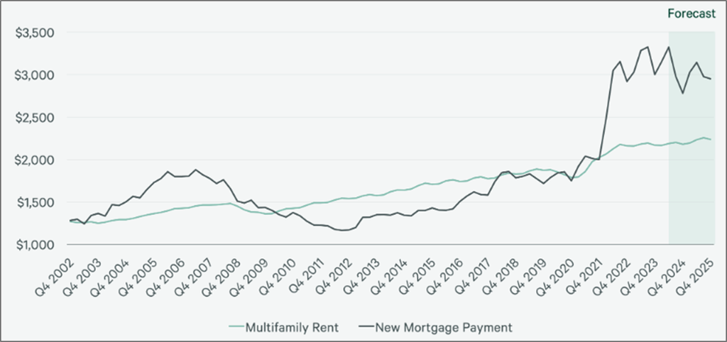 The gap between the monthly cost of owning and renting is expected to sustain renter demand through 2025. Elevated mortgage rates and high home prices will continue to keep many prospective buyers from entering the housing market. Close to 80% of existing homeowners have mortgage rates below 5%, which reduces their incentive to sell and limits resale supply. As shown in the graph below, the average monthly mortgage payment in 2025 is projected to be around $3,000, which is roughly 50% higher than the average monthly rent of about $2,000. CBRE projects that these dynamics will support rent growth of more than 3% in many large markets, compared with a national average of 2.6%.